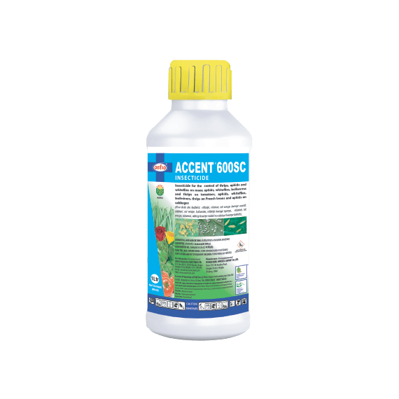 ACCENT 600 SC (Imidacloprid 600g/l) is a systemic insecticide for the control of thrips, aphids, whiteflies, mealybugs on roses; thrips, aphids, whiteflies, Leaf miners on French beans; thrips on onion; thrips, aphids, whiteflies on peas; aphids on broccoli/ cabbages; cucumber beetles, leaf miners, whiteflies on cucurbits and thrips, aphids, whiteflies on tomatoes, roses, and pepper.
